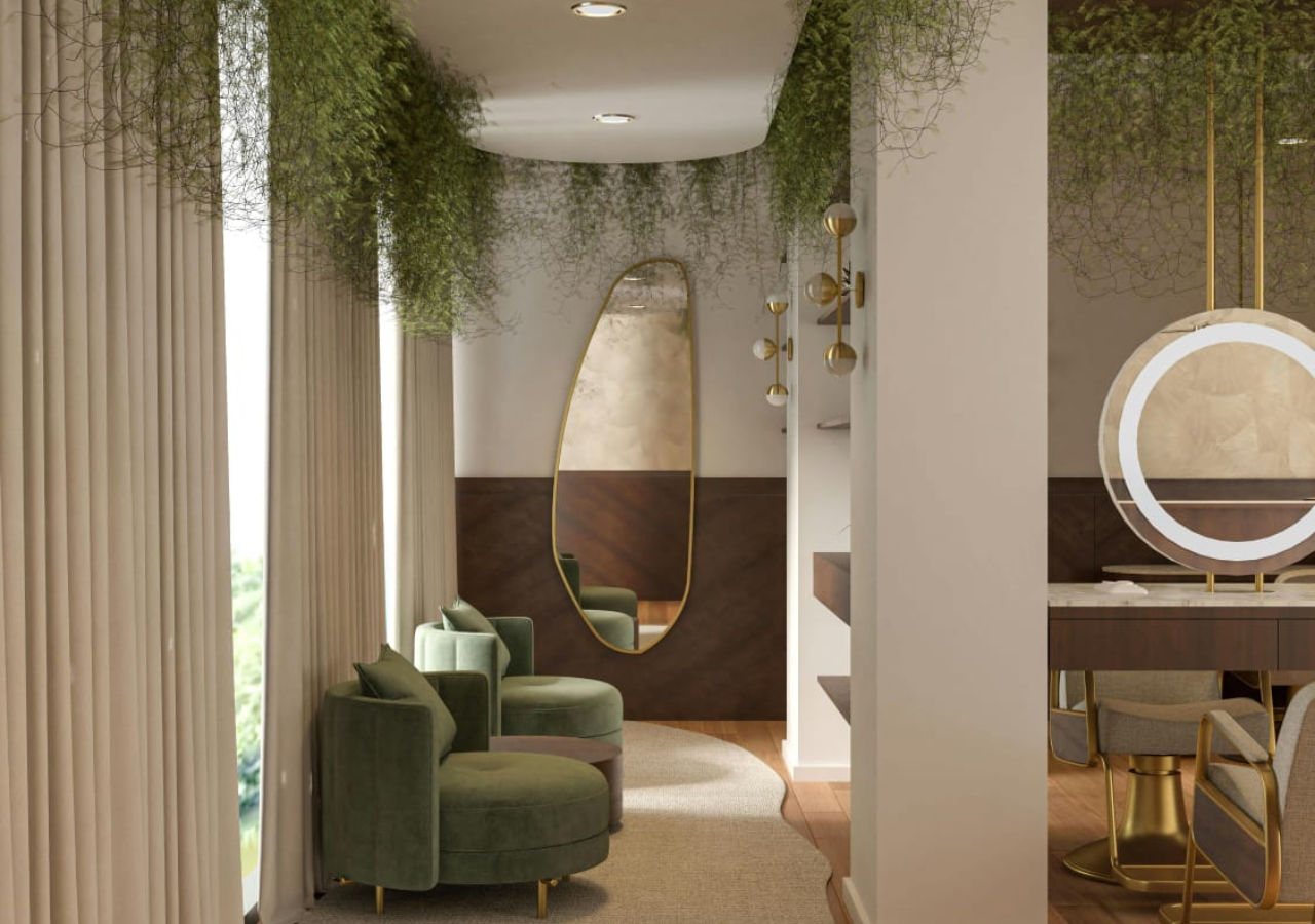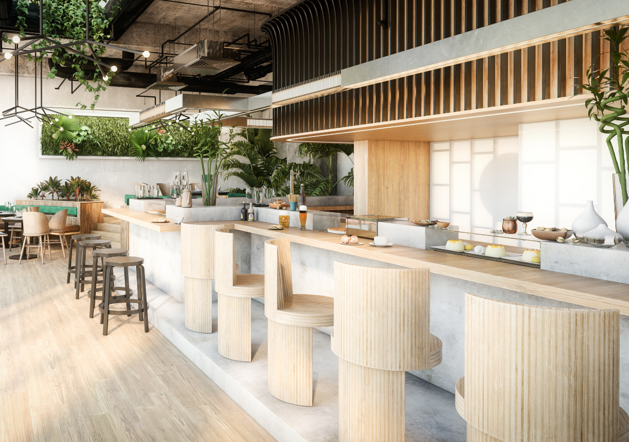 • Integration of brand identity into the space (e.g., colors, logos, materials)
